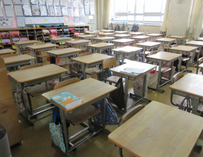 子どもたちは別教室で学習中です。机やいすがピタッと整頓されています。
