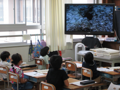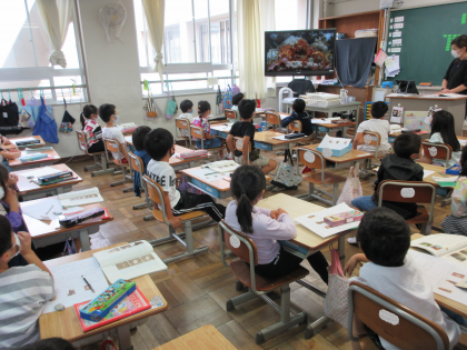 1年生では「うみのかくれんぼ」の学習中、ハマグリやタコが実際に隠れる様子がわかる映像を、QRコードから読みとって鑑賞しています。