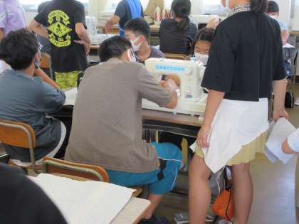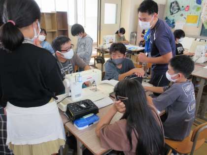よく見ると先生も交じってミシンと苦闘しています。