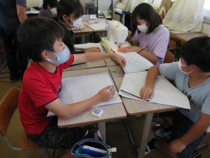 先週と違うクラスが、ナップサックづくりに取り組んでいます。