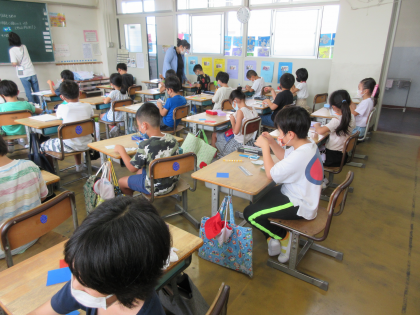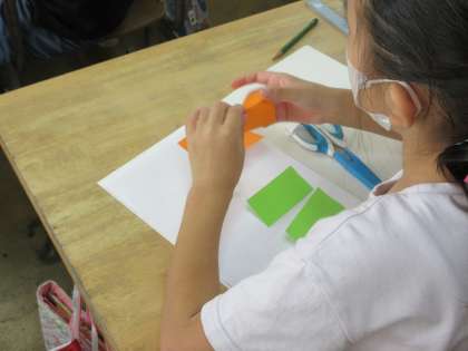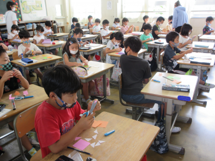 算数の学習を活かした図工でしょうか。めあては「形を使ってしきつめもようをつくろう」です。子どもたちは夢中です。