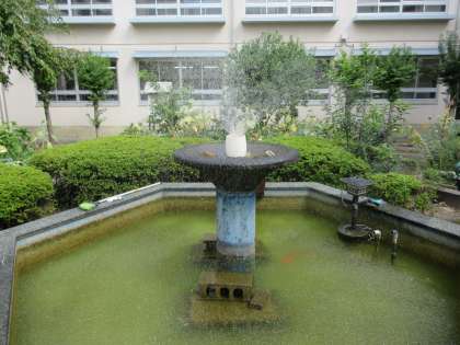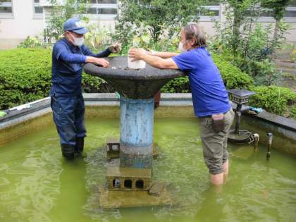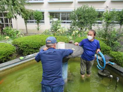 中央口からの水の出がよくなった噴水ですが、校務員さんが修繕してくださいました。池の中は思っている以上にヌメヌメで滑りやすくなっている中、詰まりを直してくださいました。