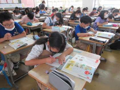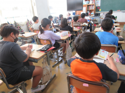 国語の教科書にある「漢字の広場」を学習しています。めあては「想像したことも加え、学校の様子を文章に書くことができる」です。想像することが楽しい学習です。どんな文章ができるのでしょう。