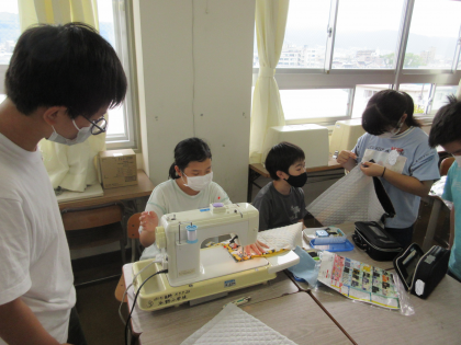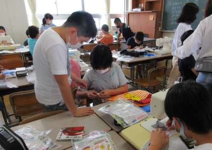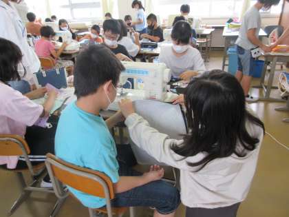 家庭科で裁縫です。修学旅行に持っていくナップザックづくりです。互いにアドバイス・・・、いや教わりながら・・・?取り組んでいます。