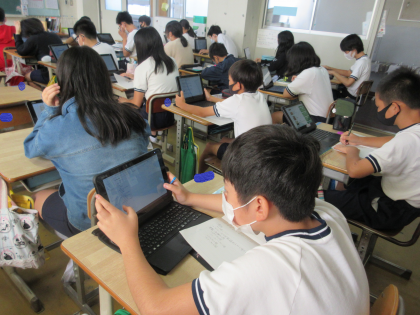 「日本文化を発信しよう」ということでタブレット端末や図書室の資料を活用して学習を進めています。