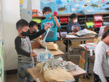 図工です。くしゃくしゃにした新聞紙を袋に詰めているそうです。「人形つくるねん!」とのこと。どのような作品ができるあがるか楽しみですね。