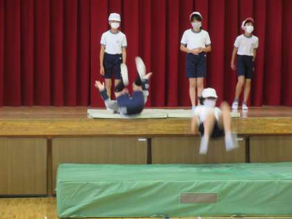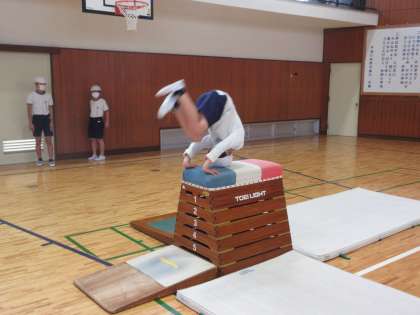 体育館で跳び箱運動です。台上前転の練習において、複数の場を設営しています。
