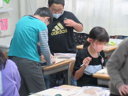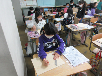 図工です。「つくって、つかって、たのしんで」という教材です。担任の先生の説明を聞いている時点でワクワクしてきました。