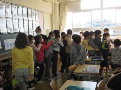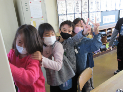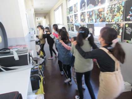 たまたま休み時間にいた教室の雰囲気です。自然発生的な人の列がどんどんつながり長くなりました。えがおです。