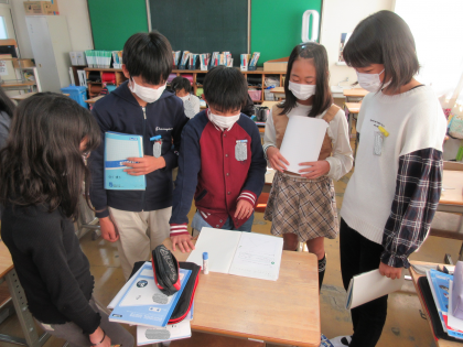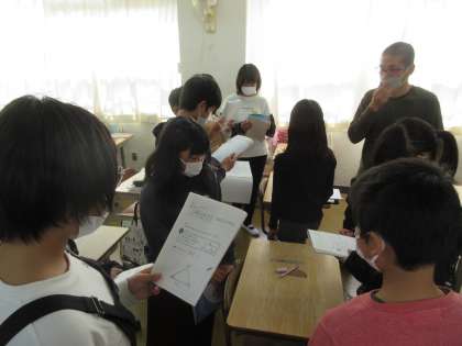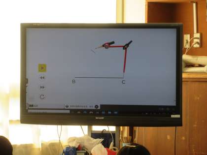 算数の学習です。めあては「三角形の拡大図、縮図を作図することができる」です。子どもたちは「エキスパート班」「ジグソー班」に分かれて作図の仕方を考えるなど、学び合う中で理解を深めていきます。