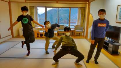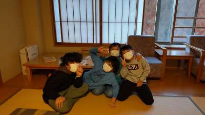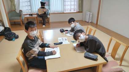 夕食までの時間、各部屋、くつろいでいます。早速一日のふりかえりを記入している部屋もありました。