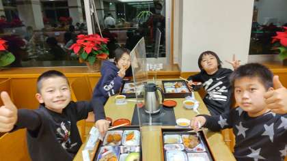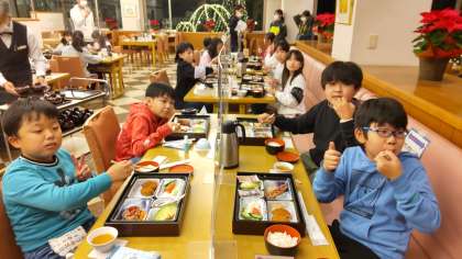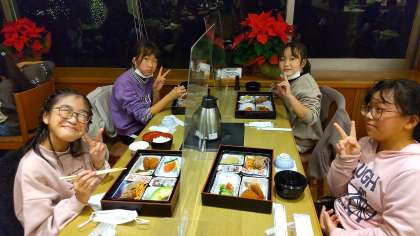 夕食です。黙食ですが、表情はニコニコです。
