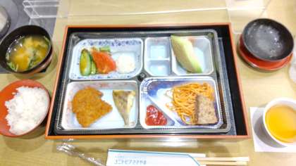 夕食のメニューです。もう一切れハンバーグがついています。
