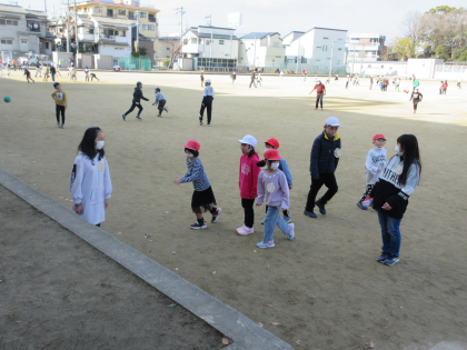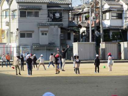 クラス遊びをしている学級があります。低学年と遊んでいる高学年の子どもたちもいます。心温まる光景です。また、複数の先生たちも運動場へ出て子どもたちを見守っています。