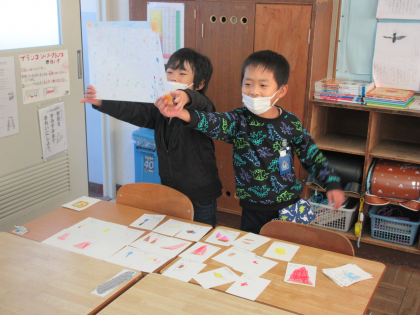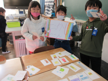 めあては「ことばのかいものをしよう」です。お店がたくさんあります。店員さんとお客さんを交代でおこないます。