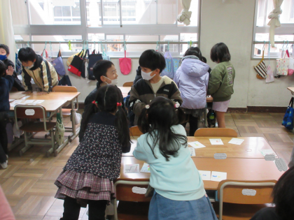 めあては「おみせやさんごっこで、しょうひんをうったりかったりすることができる」です。店員さんとお客さんになりきって、元気よく「売り買い」しています。とっても楽しい時間です。