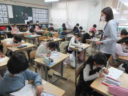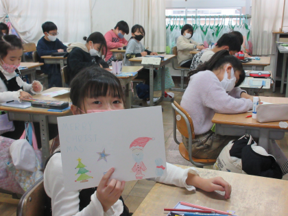 クリスマスカードをつくっています。最後はみんなで交換会を開くそうです。