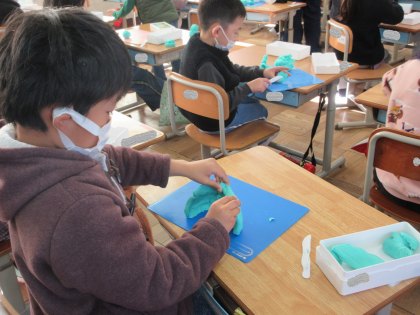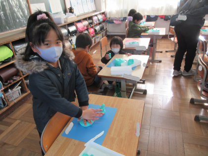 冬のイメージで、雪だるまや、かまくらをつくっています。一人ひとりが自分のイメージした世界に入っています。楽しそうです。