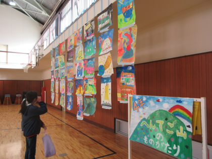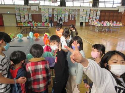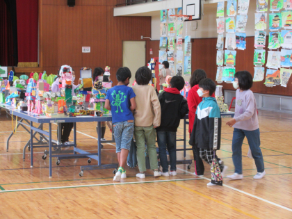 図工作品展最終日ということで、校長先生も改めてゆっくり鑑賞しようと体育館に行くと3年生も鑑賞していました。