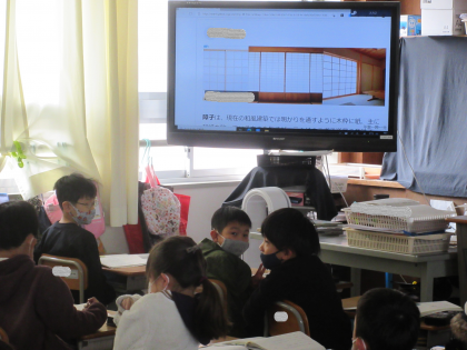 国語「たぬきの糸車」の学習です。障子を知らない子どもたち・・。大型テレビでの紹介と併せて、障子にうつる影についても、カーテンを使ってイメージを膨らまします。