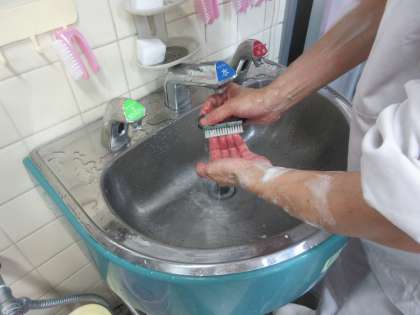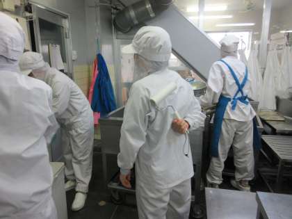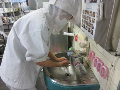 給食調理室には校長先生も入れません。調理員のみなさんも異物が混入しないよう細心の注意を払っています。