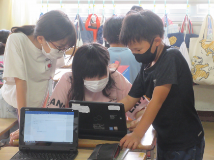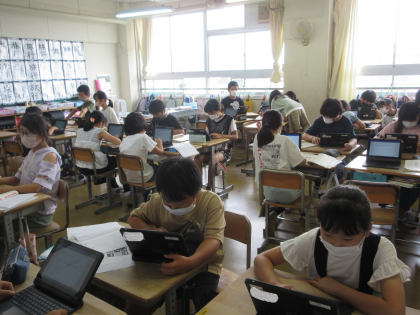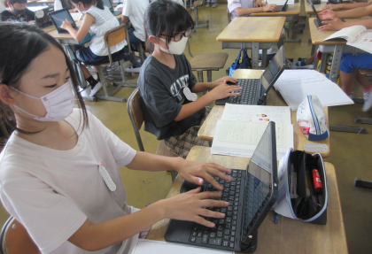 国語の学習です。SDGsの記事を書きます。タブレット端末を駆使しています。