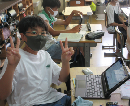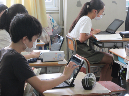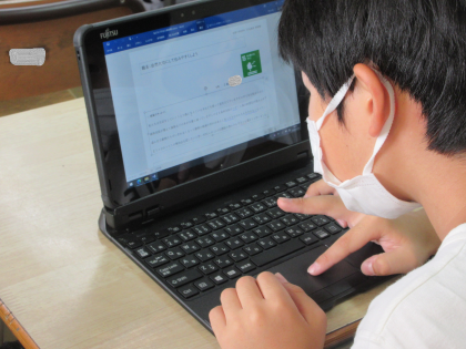 SDGsについて調べたことをふまえ、自分の考えを整理します。タブレット端末を使って作成です。