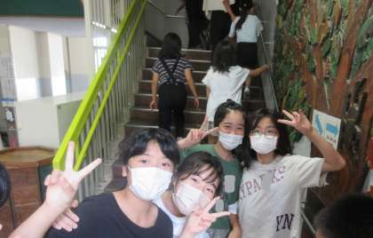 給食が終わり食器・食缶などの返却活動をした子どもたち、おいしい給食を食べたあとでとても笑顔です。