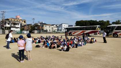 今日は4年生の遠足です。8時30分定刻どおりバスで出発しました。大和川方面、行ってきます。