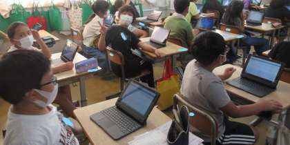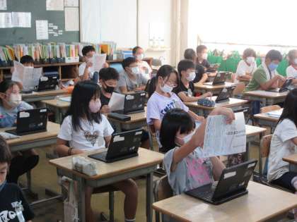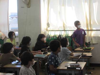 子どもたちからの質問では、「貼り付けた画像に書き込みはできますか?」や「トリミングはできますか?」など、よりよいスライドをつくろうとする意欲、そして日頃端末を使っているからこその専門的な質問が出ています。