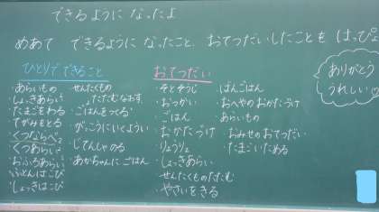 1年生の教室です。 一人でできるようようになったことやおてつだいした内容がたくさん書かれていました。