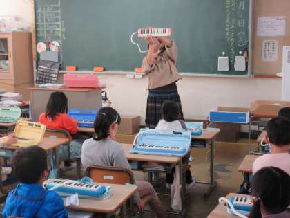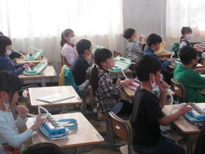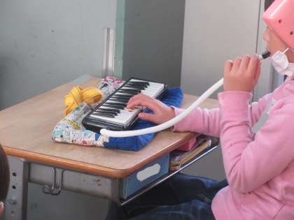 けんばんハーモニカを使った音楽の時間です。交互に吹くなど予防対策を講じたうえで実施しています。