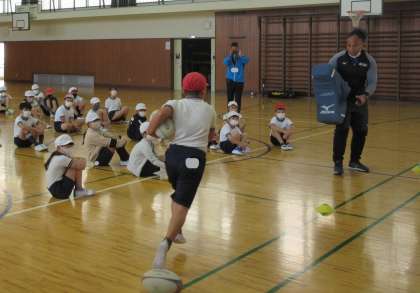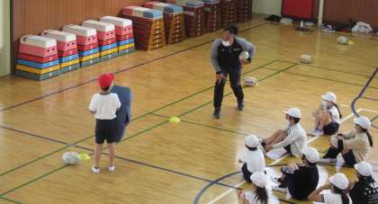 ボールを大切に扱うこと、相手を思いやること、ラグビー体験を通じて多くのことを伝えてくださいました。このあと、教頭先生、そして担任もタックルです。