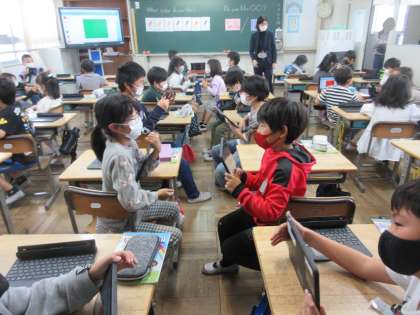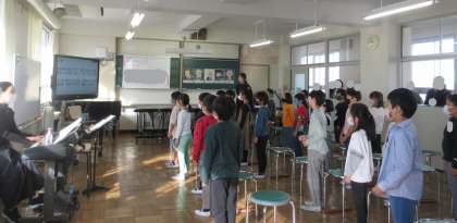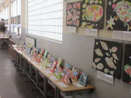 3年生です。音楽と外国語活動の様子です。そして教室前ろうかには作品が展示されています。