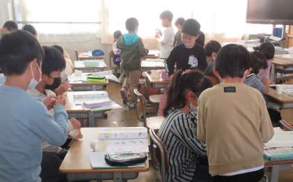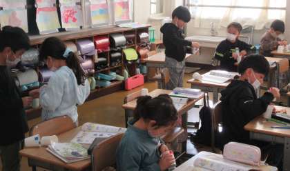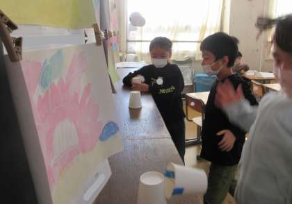 図工です。「ぴょんコップ」というタイトルです。助け合ってつくります。「校長先生、見て〜!」と見せてもらいました。高く跳びます。
