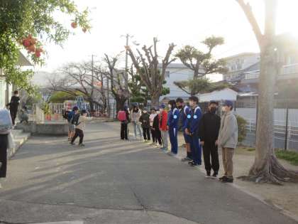 さっそく朝のあいさつ運動にもいっしょに参加です。