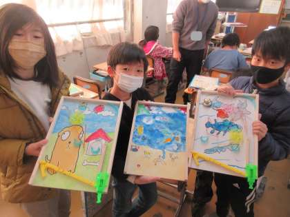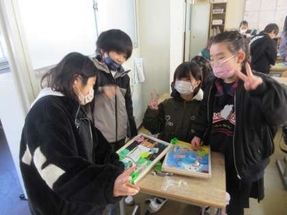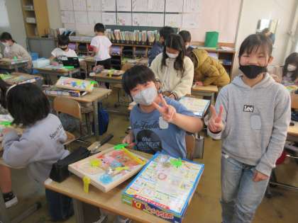 図工の時間です。オリジナルのコリントゲームを作っています。