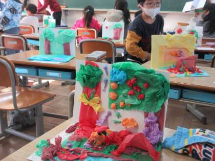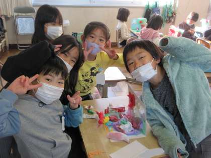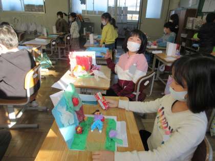 1年生の教室に行くと、今から図工作品展に向けて体育館へ作品をもっていくところでした。