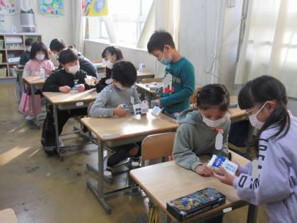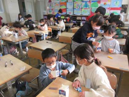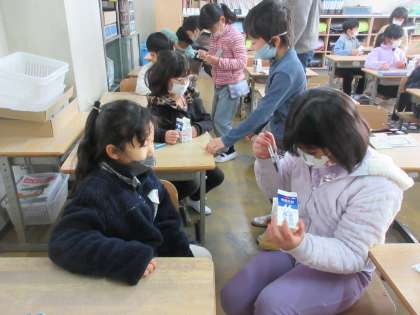「パッチンジャンプ」というおもちゃを、2年生が1年生に教え、いっしょに遊びます。