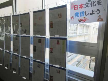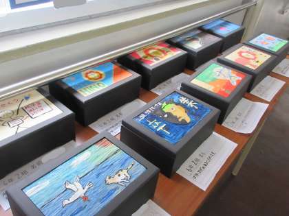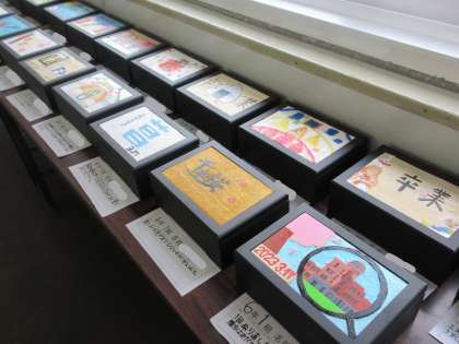 6年生教室前のろうかです。ステキな作品が並べられています。