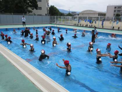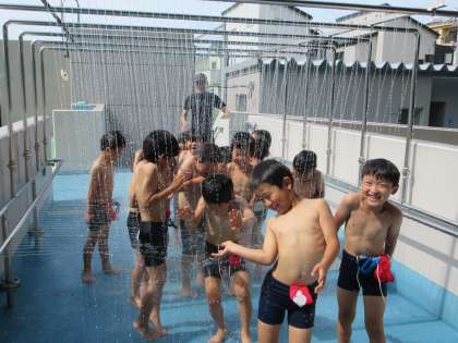今日は初めての小学校プール。名物?地獄のシャワーに大歓声。