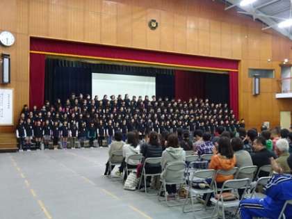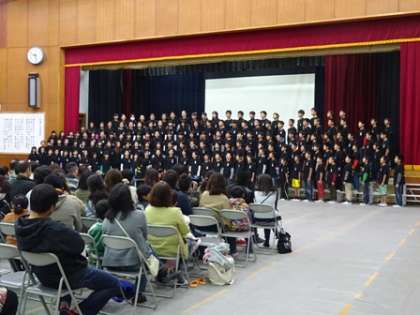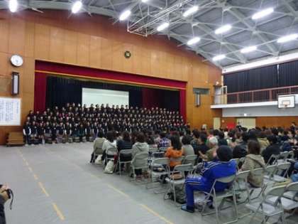 1部ではスライドショーの写真によって修学旅行の様子をみていただき、2部では「呼びかけ・合唱・群読」により、今まで学んできたことを気持ちを込めて発表しました。