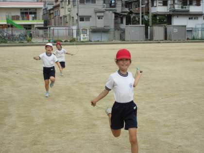 体育では縄跳びの駆け足跳びの練習。上手に走り回っている子がたくさんいました。