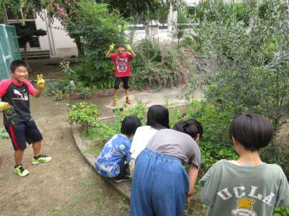 環境委員会の子どもたちが中庭の草むしりをしていました。いつもありがとうね。
