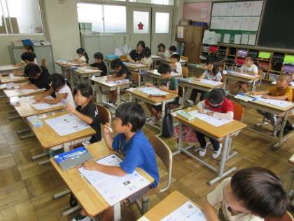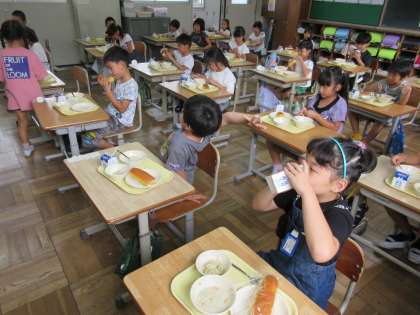 給食のクラムチャウダー。初見のためお残しで手を挙げる子がいっぱい。先生に「みんな、一口食べてみて」と言われ食べた後の子どもたちの目がキラリ。今度はお代わりのために勢いよく手を挙げていました。