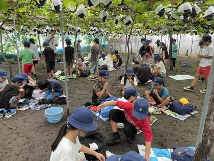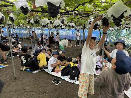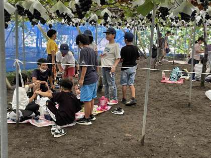 お楽しみのぶどう狩り。大きすぎて食べきれない班もありました。