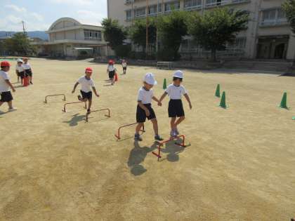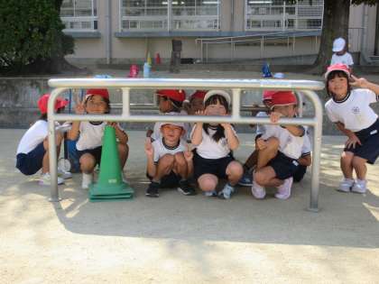 今日は久しぶりに暑い一日。体育のお茶タイムの時間に日陰に集まっています。でも、集まりすぎでは。暑くないのかな...。