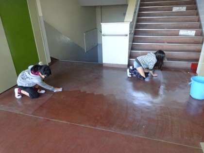 手洗いの周りや鏡も力を入れて磨いています。床もていねいに掃いて拭いています。気持ちがいいです。トイレがピカピカになってきています。トイレ掃除が一生懸命にできるってすばらしいことですね。
