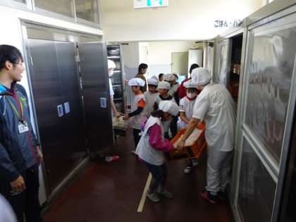 給食当番が、栄養教諭の先生や調理員さん、給食委員の人たちに手伝ってもらいながらおかずの入った食缶やパン・おぼん・牛乳を受け取り教室に運びます。