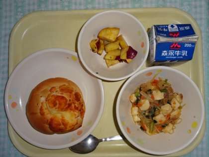 今日の給食は、「チーズパン・とうふのチャンプルー・大学芋・牛乳」でした。